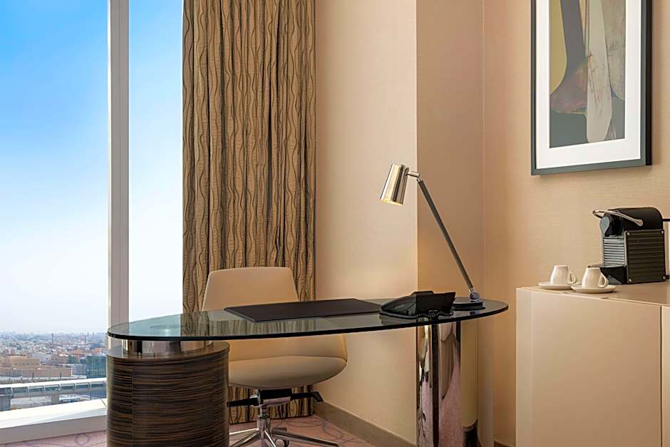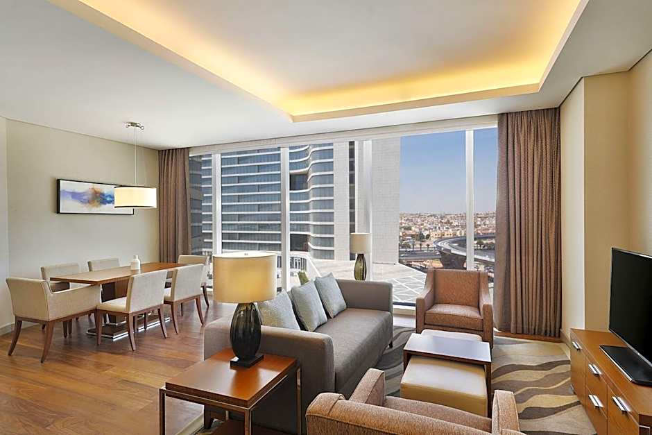 Features: It is one of the two individually decorated luxurious suites in our Hilton, consist of three bedrooms (two twins bedrooms and one master bedroom) with a beautiful view in each of them. In addition, there is a private office and a wonderful dining room decorated with a marble. Complimentary wireless Internet access keeps you connected, and satellite programming is available for your entertainment. Private bathrooms with shower&tub combinations feature jetted bathtubs and complimentary toiletries. Views: Business Park