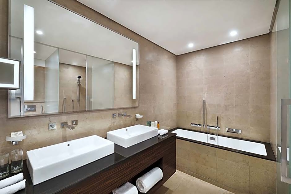 Features: The Hilton Deluxe One-bedroom suite features neoclassic décor and cozy, rooms come with a choice between a king-size bed or two single beds, work desk and Living room with a relaxing sofa and coffee corner. Marble bathroom which features a combined bathtub and stand shower.