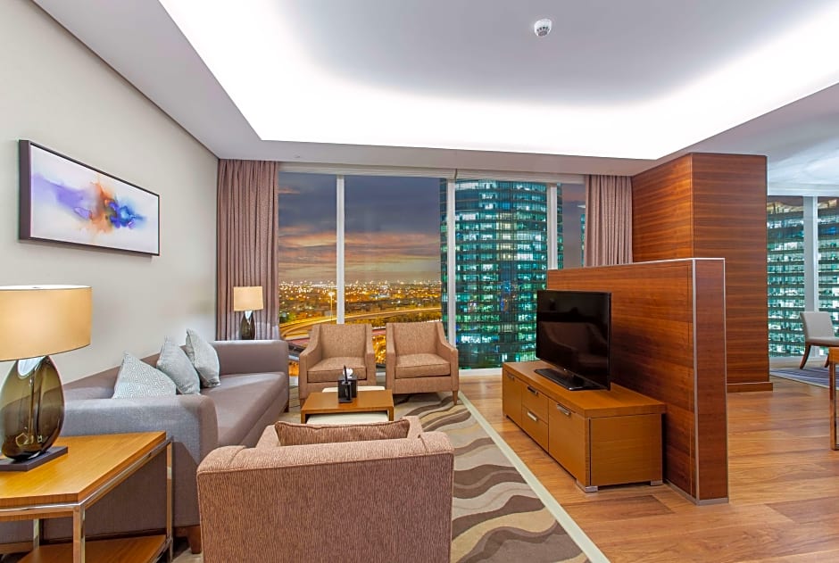 Features: The Hilton Deluxe One-bedroom suite features neoclassic décor and cozy, rooms come with a choice between a king-size bed or two single beds, work desk and Living room with a relaxing sofa and coffee corner. Marble bathroom which features a combined bathtub and stand shower.